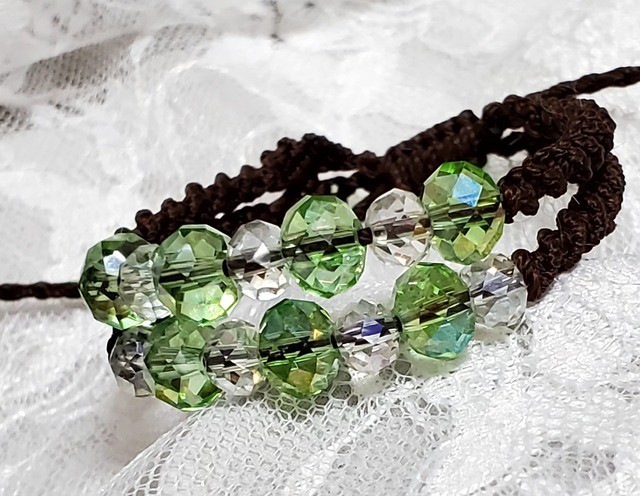 シトラスグリーンのスワロフスキー 水晶のサザレ ゴールドカラーの金属パーツ(真鍮にゴールドメッキ) アジャスター カニカン ①パーツは可能な限り切れ目が目立たないように製作してありますが、繊維に引っ掛かる恐れがございますので、ニットなどお召しの際はご注意頂けますよう、お願い申し上げます。 ②肌に触れる部分はメッキ加工した金属ですので、アレルギーをお持ちの方には不向きです。