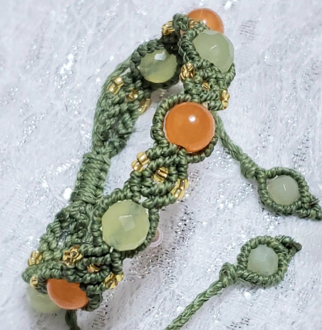 オレンジカルセドニーとイエロージェイドを使用。 あさぎ色のマクラメコードでまとめました。