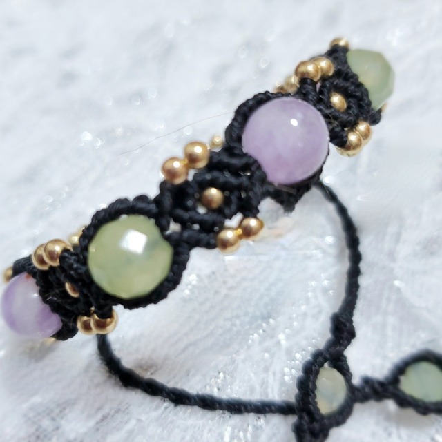 ラベンダーカラーのアメジストとレモンジェイドを使用。 ブラックのマクラメコードとゴールドのメタルビーズで仕上げました。