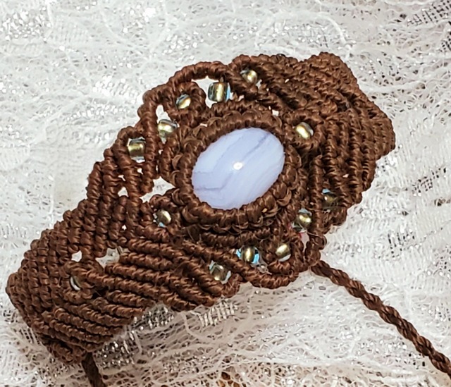 鮮やかなブルーカルセドニーとアマゾナイトの組み合わせ。 ブラウンのマクラメコードで仕上げました。