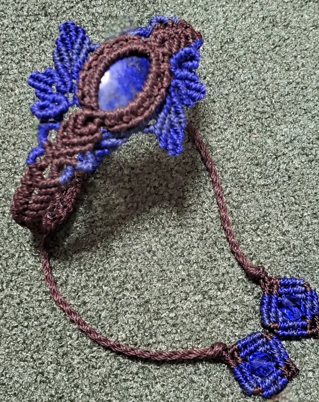 マーキスシェイプのラピスラズに、ブラウンのマクラメコードと、2種類のブルーのマクラメコードで装飾しました。