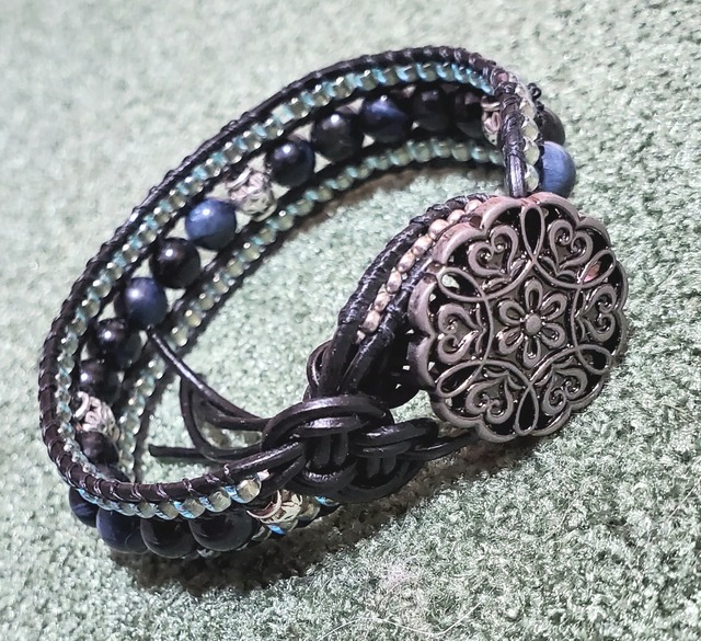 ダークブルーに浮かぶ光の反射が美しい天然石を使用。 銀古美の透かし彫り風のボタンを合わせ、シーズン問わず着用頂けると思います。
