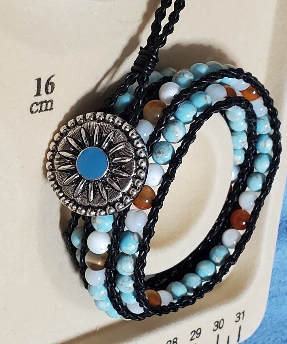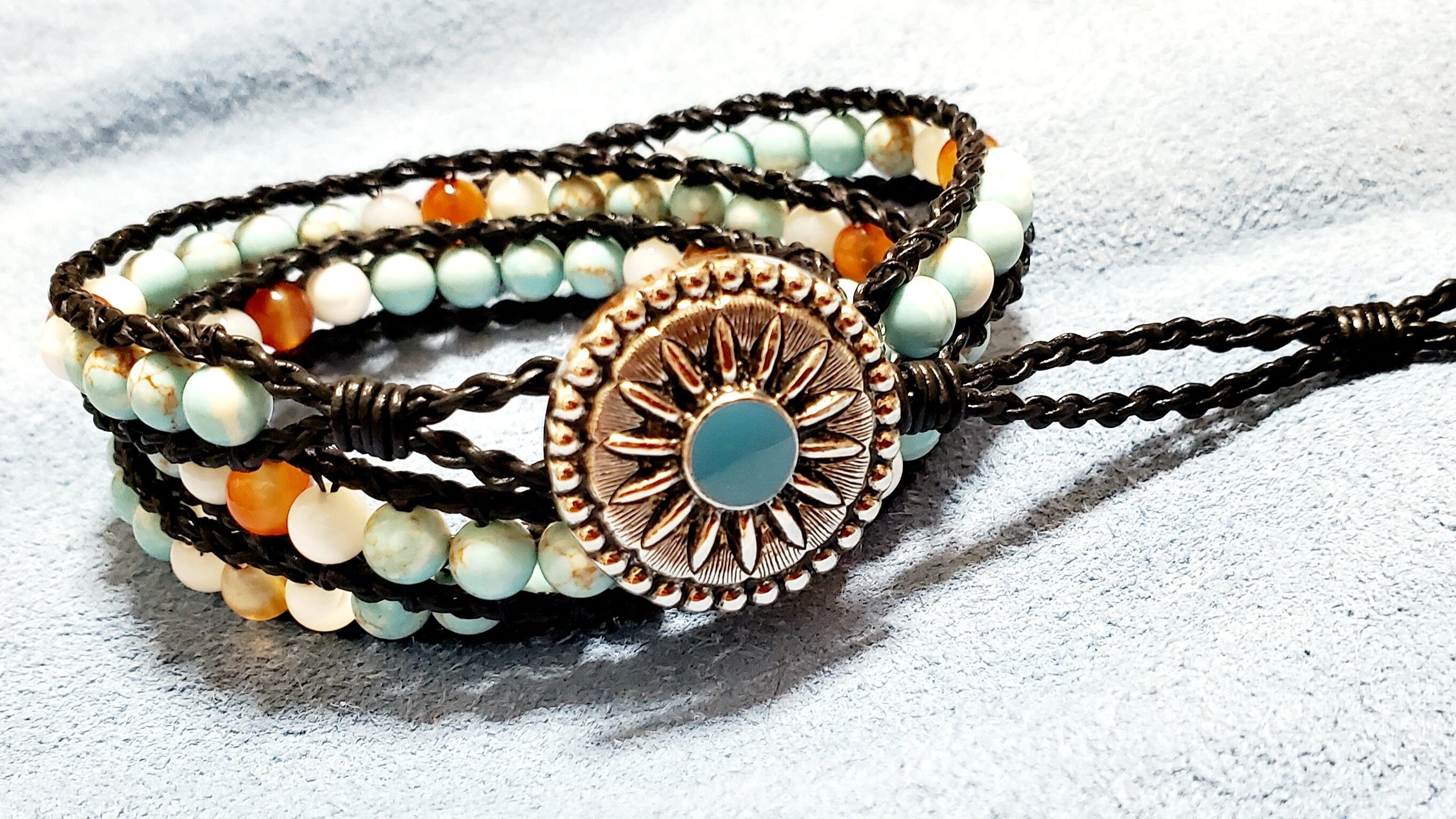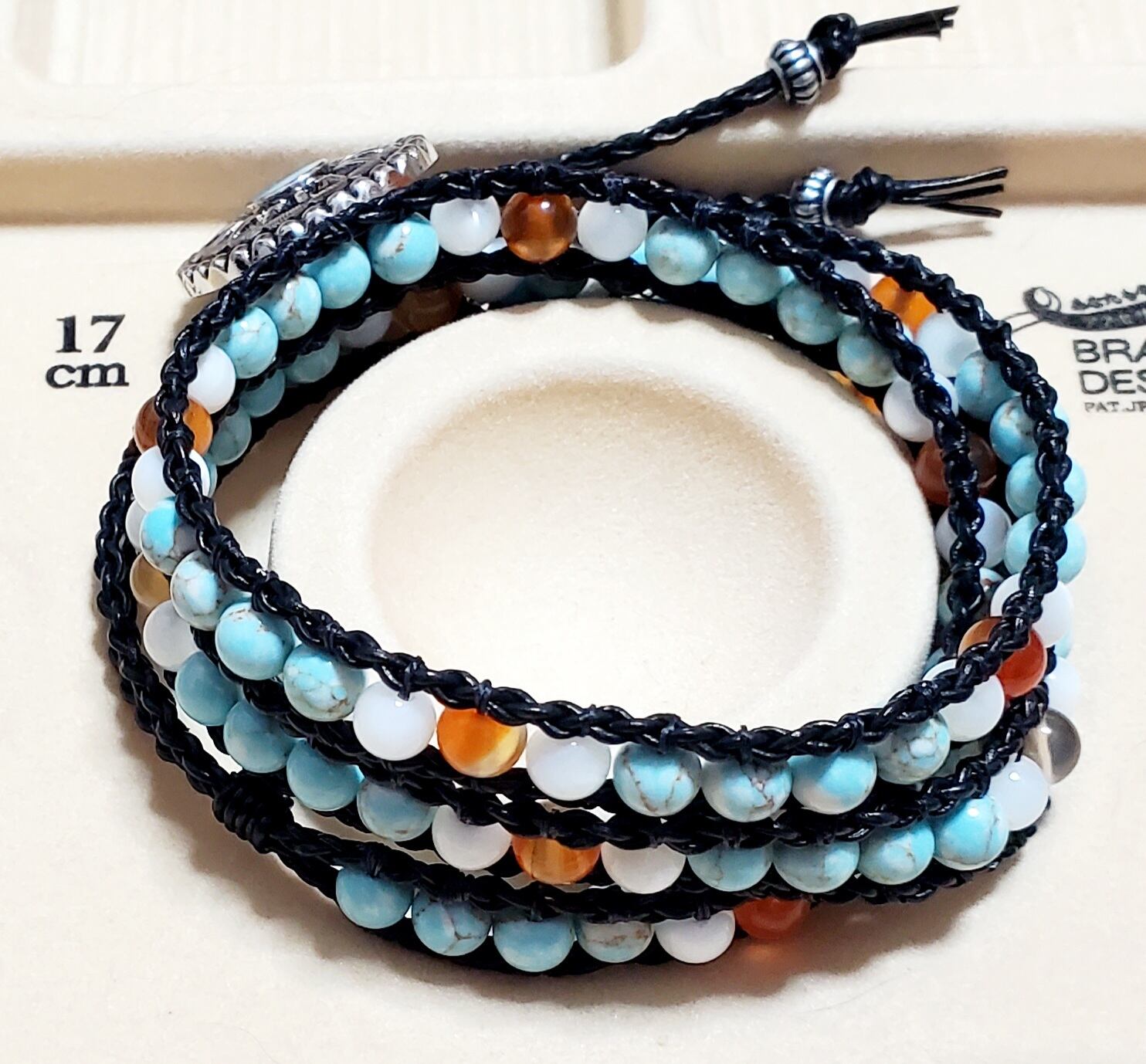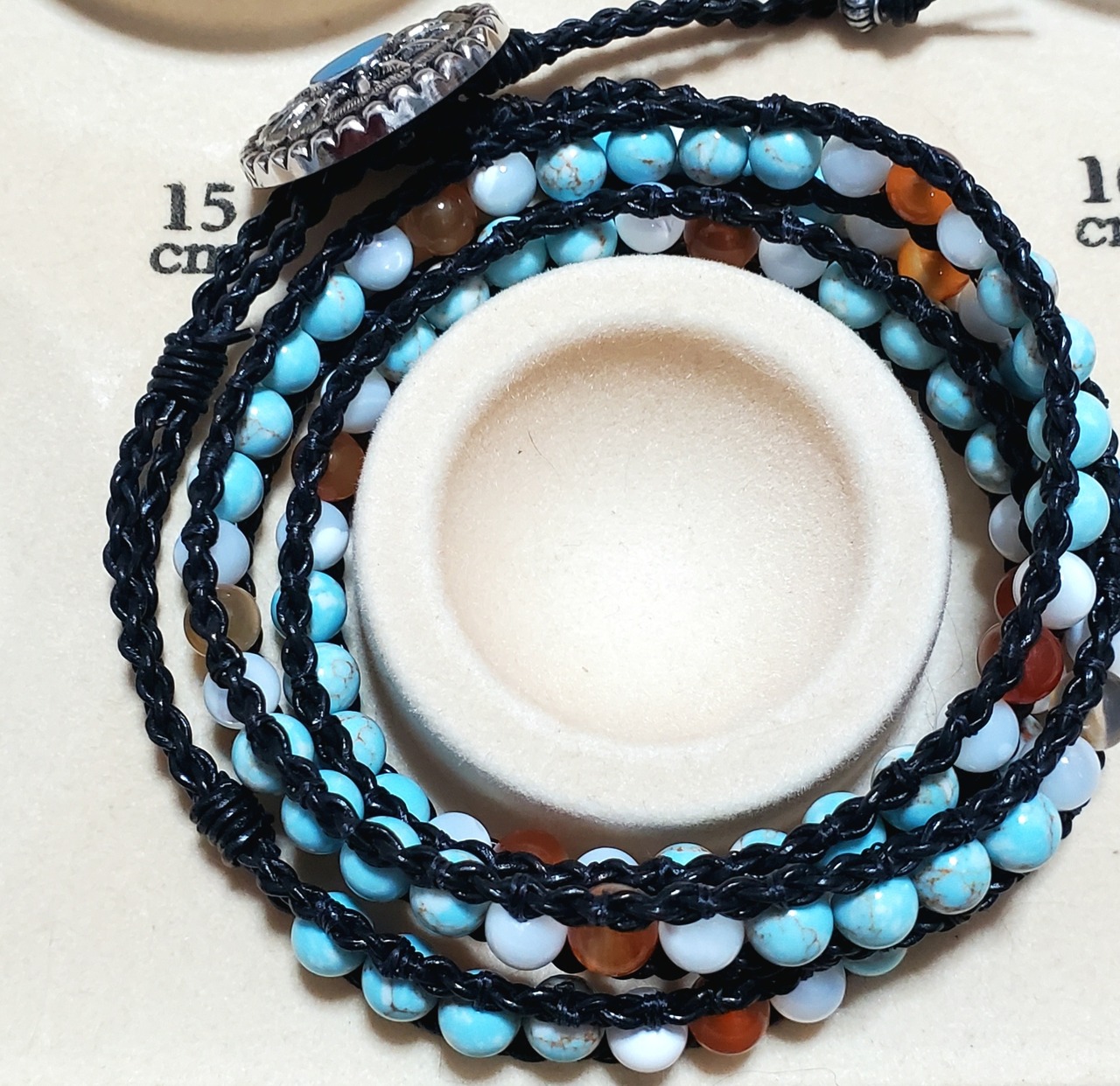 四つ編みの革紐に、ターコイズ、カーネリアン、マザーオブパールを編み付け、ボタン留めに仕上げたラップブレスレットです。