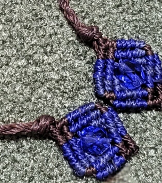 マーキスシェイプのラピスラズに、ブラウンのマクラメコードと、2種類のブルーのマクラメコードで装飾しました。